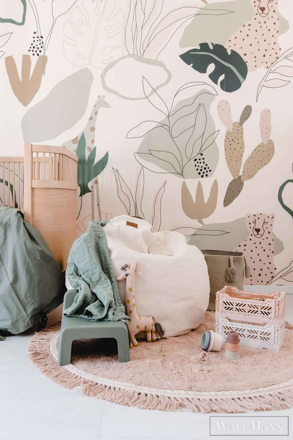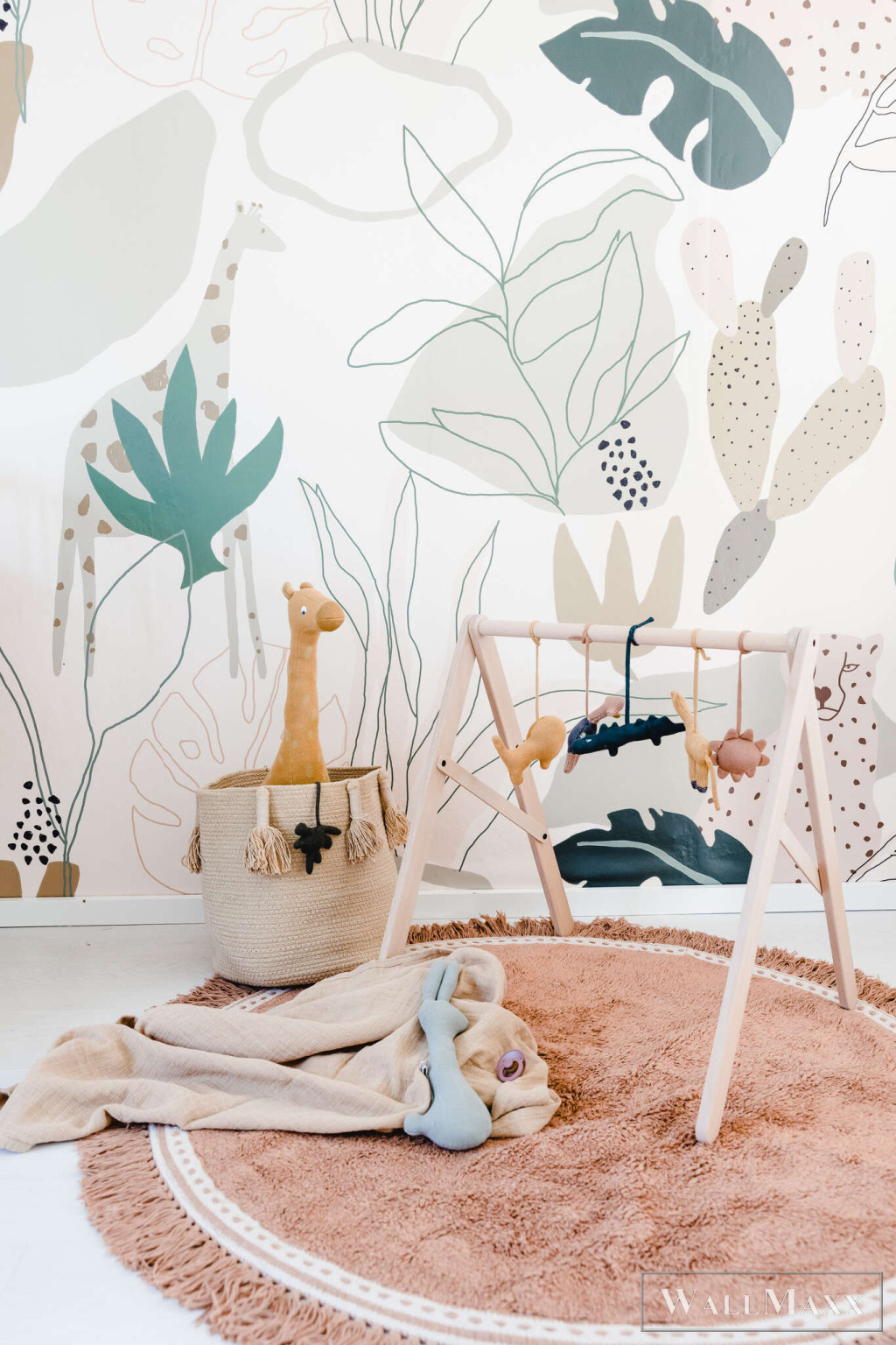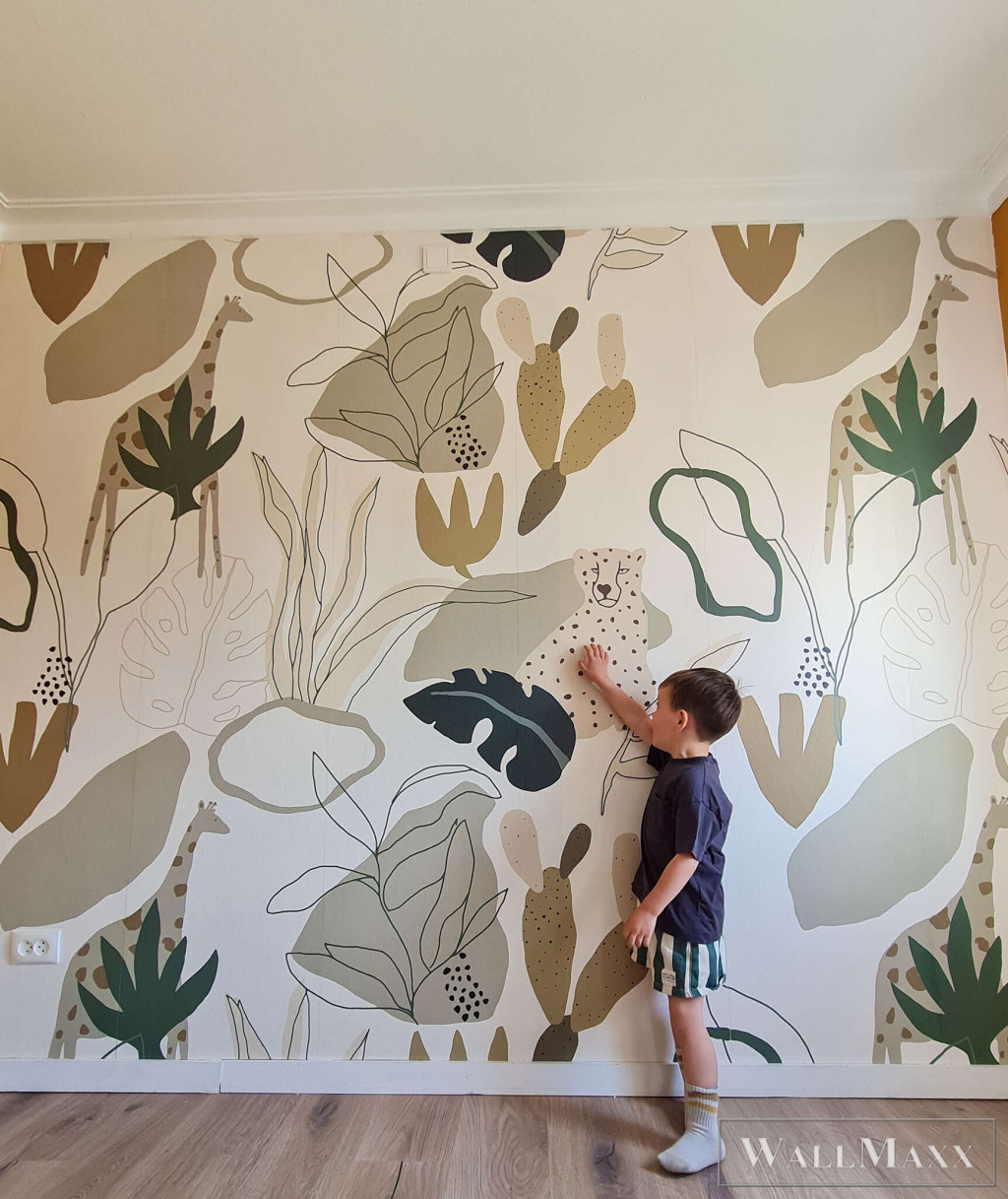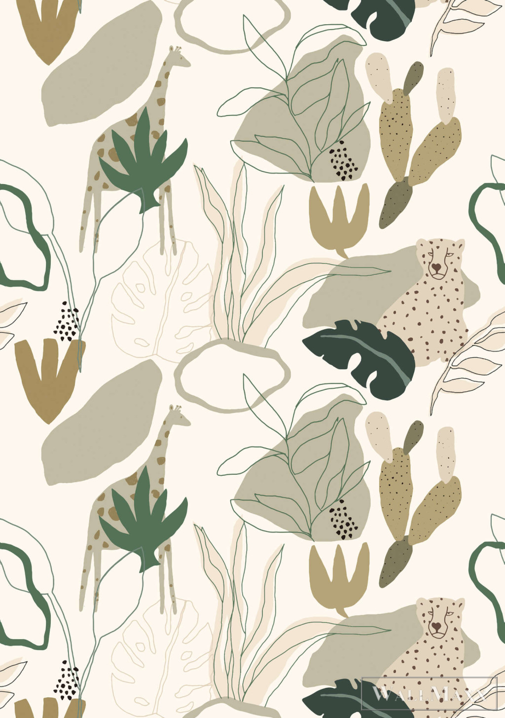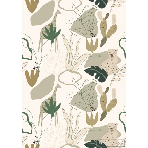 Ez a tapéta a modern, absztrakt formákat ötvözi Afrika növény- és állatvilágának szelíd visszhangjával. A stilizált levelek, kaktuszok és virágelemek között diszkréten illusztrált zsiráfok és gepárdok jelennek meg – diszkréten integrálva az összképbe. A színpaletta természetes és meleg: az olívazöld, a terrakotta, a homok, a bézs és az éjkék díszítői harmonikus, mégis élénk megjelenést kölcsönöznek. A művészi, kézzel rajzolt stílus laza eleganciát kölcsönöz a dizájnnak. Ideális stílusos gyerekszobákba vagy kreatív nappalikba, egy csipetnyi szafari hangulattal.