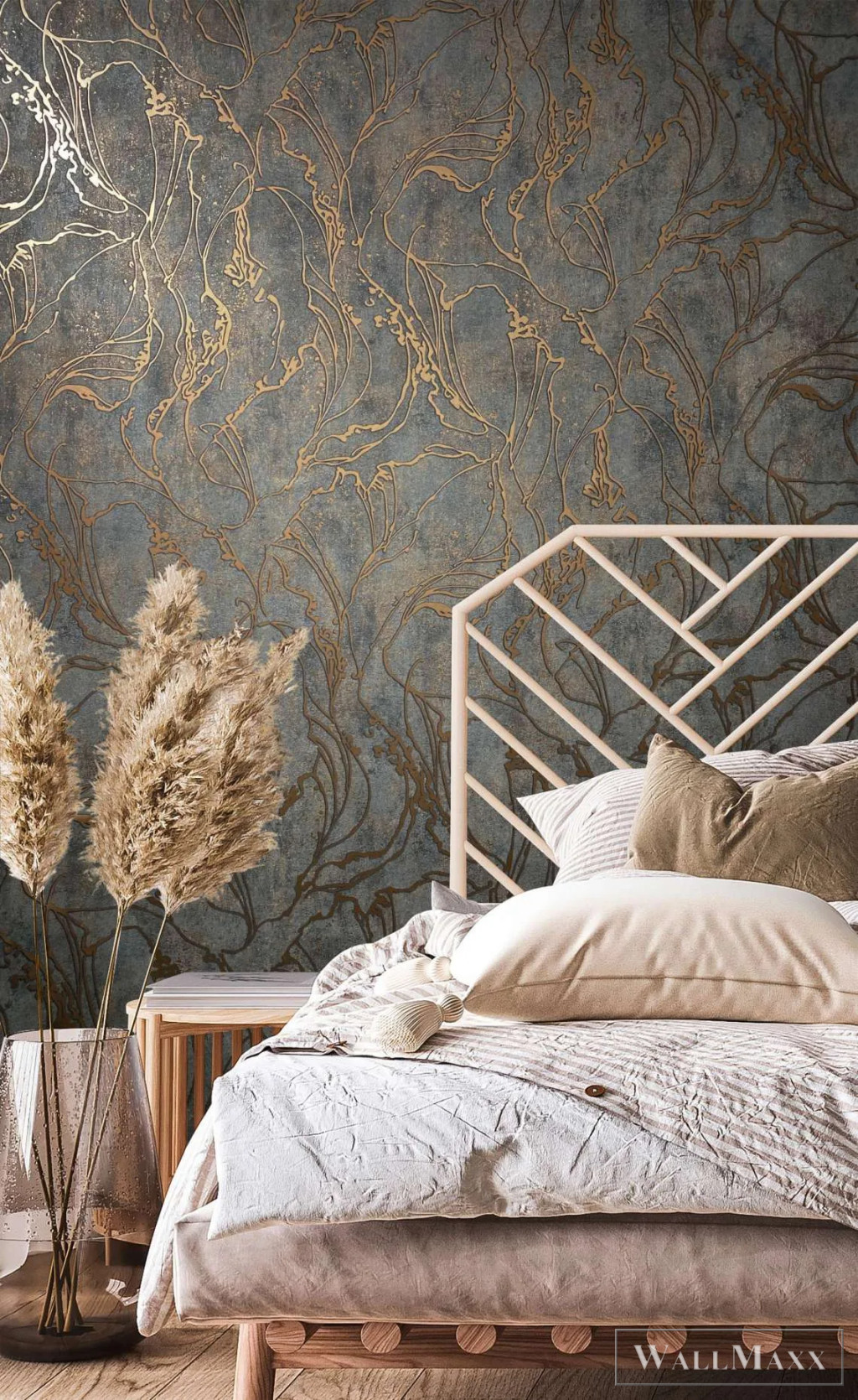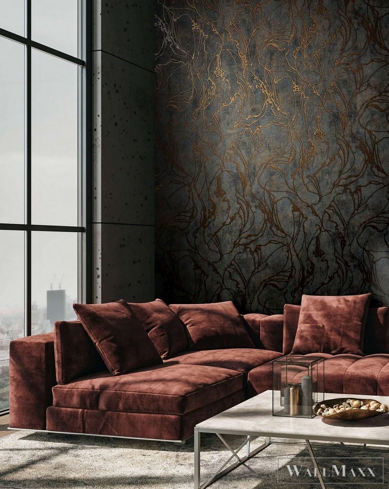 • Damasztmotívum: Egy időjárás által megviselt damasztmotívum látható egy betonszerű háttérrel. Ez a háttér a kollekcióban egyszínű kombinációként is megtalálható.