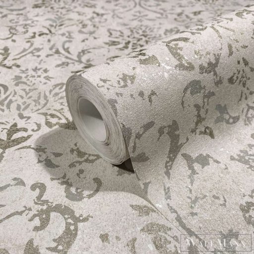 • Damasztmotívum: Egy időjárás által megviselt damasztmotívum látható egy betonszerű háttérrel. Ez a háttér a kollekcióban egyszínű kombinációként is megtalálható.
