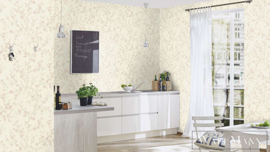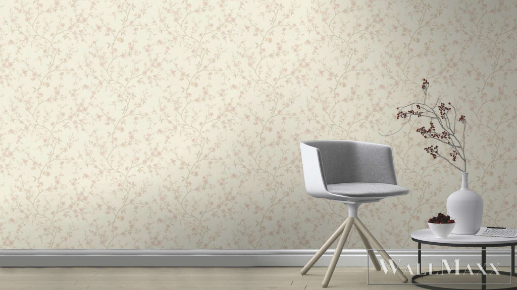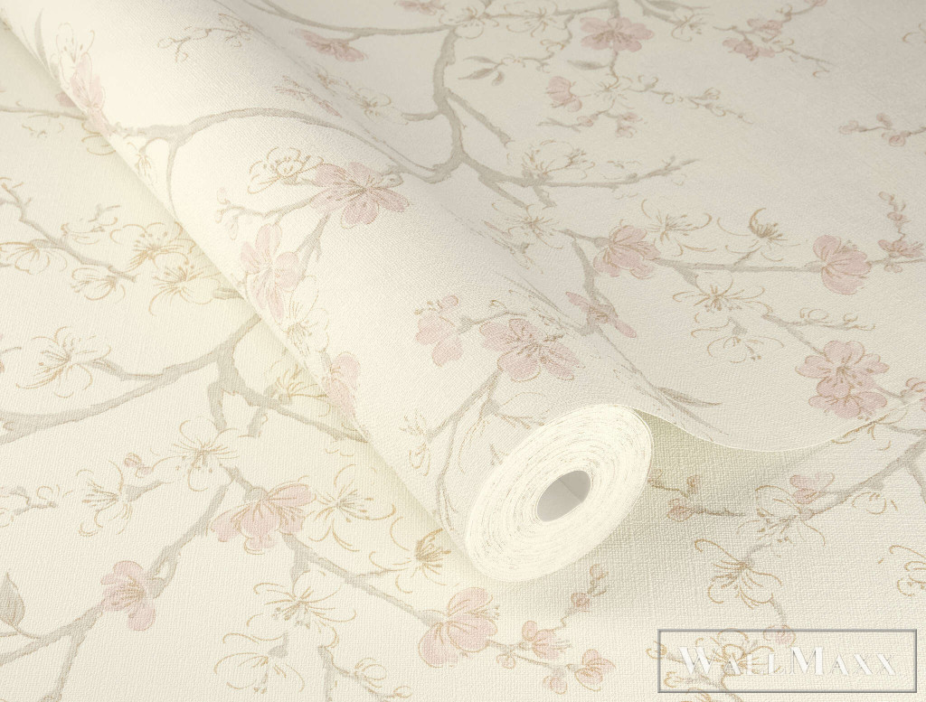 Romantikus, könnyed tapéta finom, rózsaszín virágágakkal krémfehér háttéren