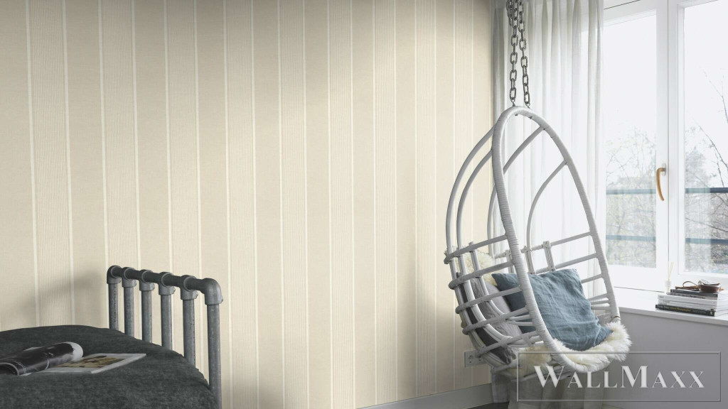 Visszafogott csíkos tapéta váltakozó széles és finom vonalakkal természetes bézstónusokban